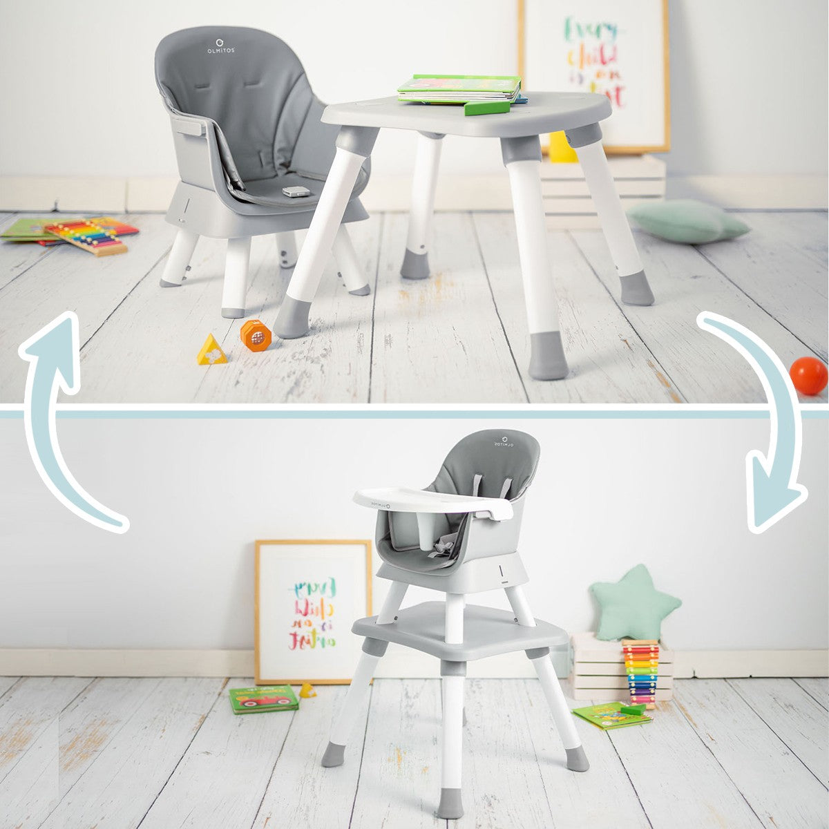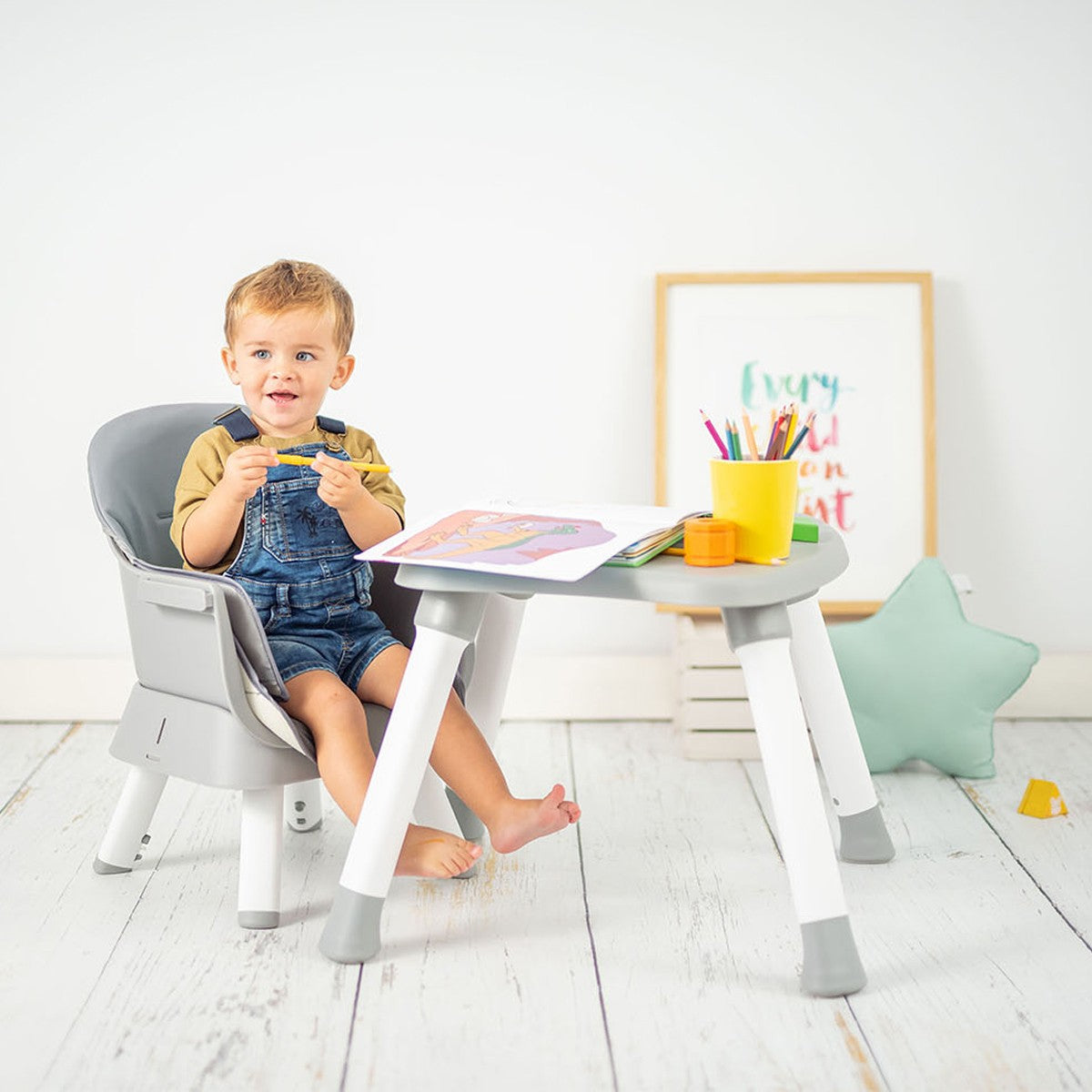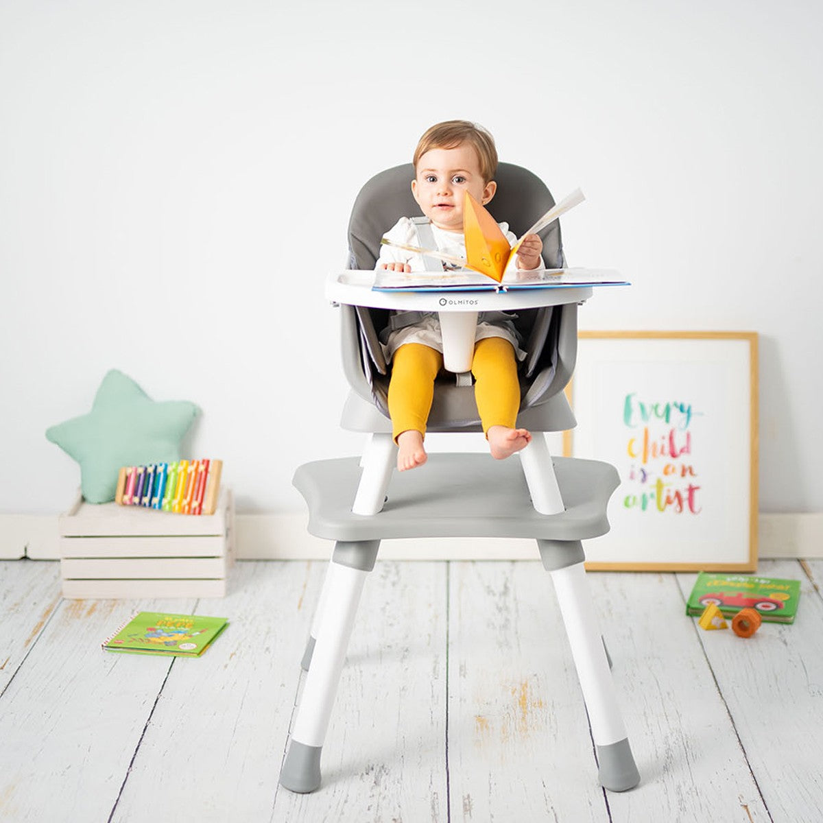 Uma cadeira alta com diferentes modos de uso que se adapta ao desenvolvimento e crescimento dos pequenos da sua casa. Aqui, eles começarão a se alimentar de forma complementar, se juntarão ao resto da família à mesa nas refeições e, eventualmente, terão sua própria cadeira e mesa para comer, brincar ou pintar. Uma cadeira alta com muita vida e diversão garantida.